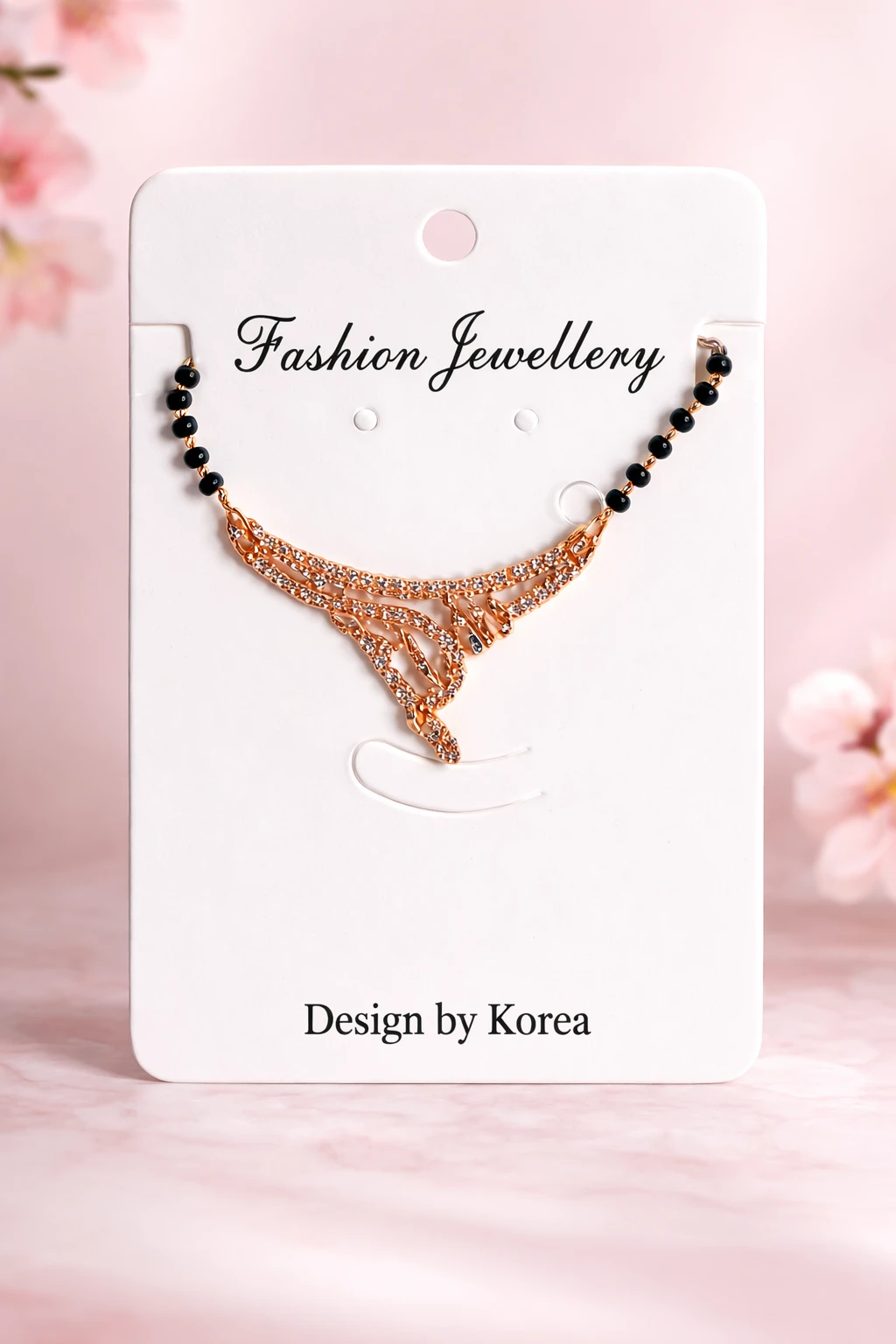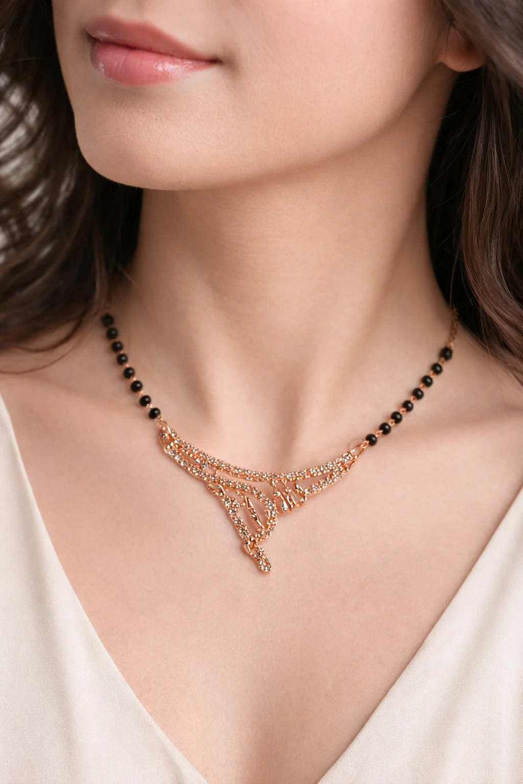 Enhance your traditional look with this elegant black bead mangalsutra-style necklace featuring a beautifully crafted gold-toned pendant. Designed with intricate detailing and studded with shimmering stones, this necklace blends modern fashion with ethnic charm. The black bead chain adds a classic touch, making it perfect for daily wear as well as special occasions like weddings, festivals, and parties.