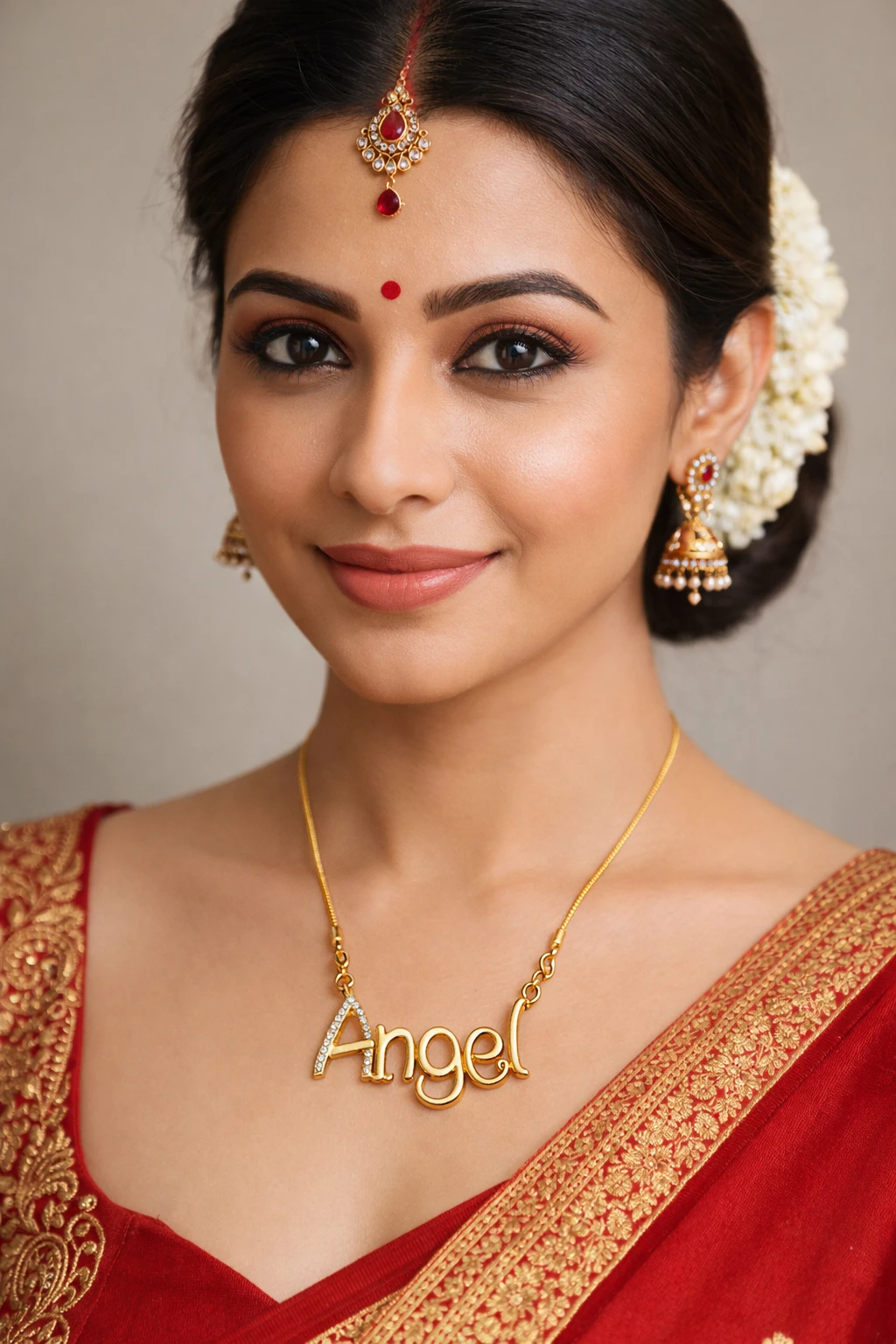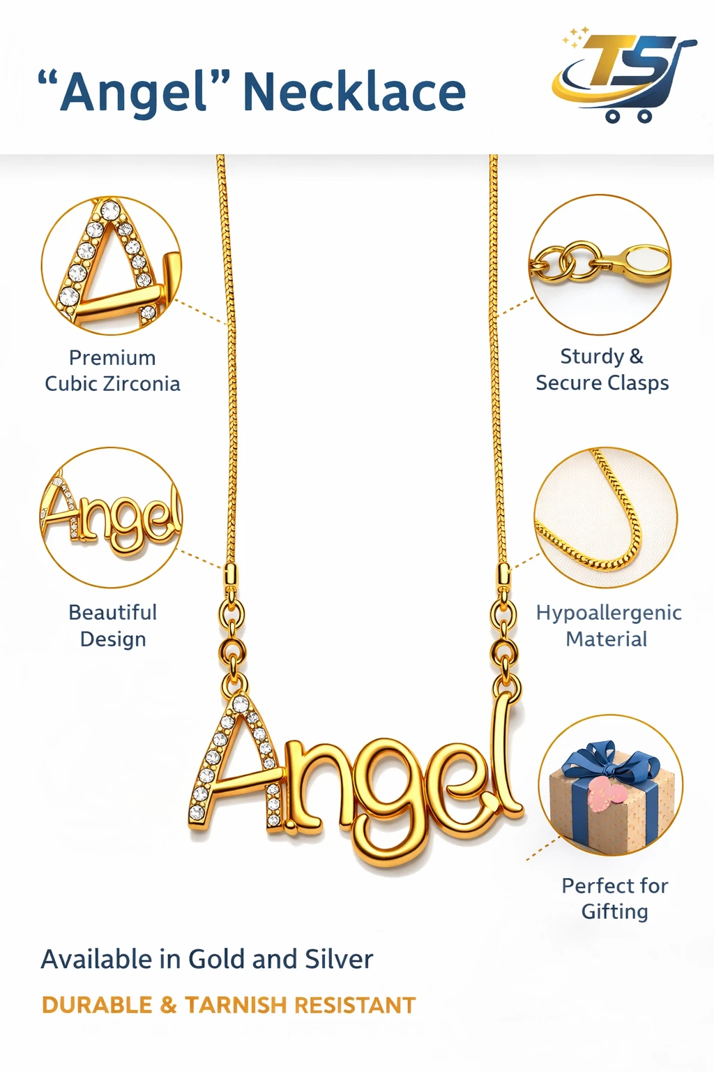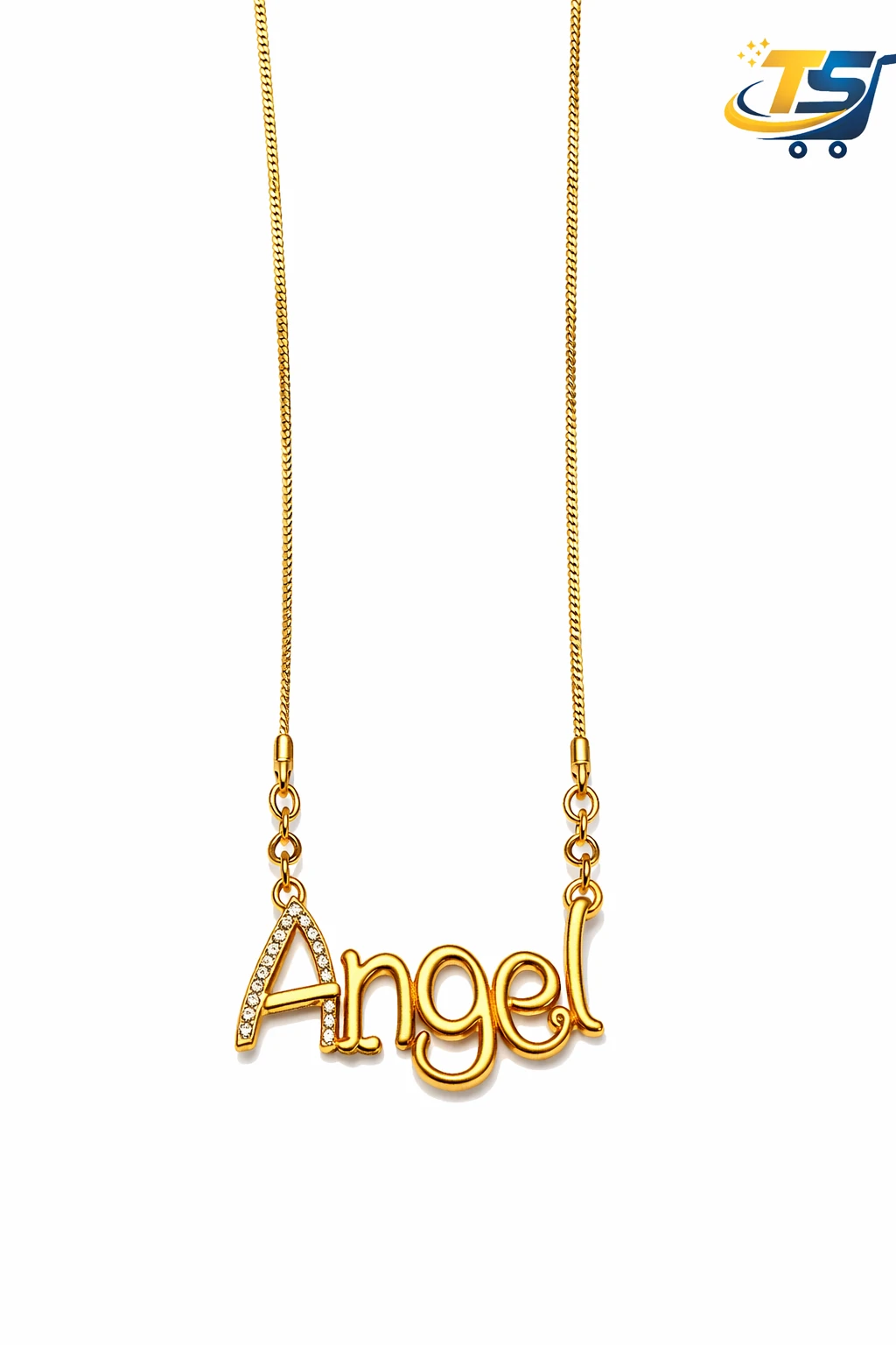 This elegant “Angel” Name Pendant Necklace is crafted with a premium gold finish, designed to add a personalized and stylish touch to your everyday and festive look. The pendant features a beautifully styled “Angel” lettering, highlighted with delicate stone detailing on the initial letter, giving it a subtle sparkle and luxurious appeal.